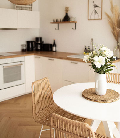 Conçu pour accueillir jusqu’à 4 personnes, le Gîte Ouest vous enveloppe dans une atmosphère lumineuse aux tons beiges et naturels.